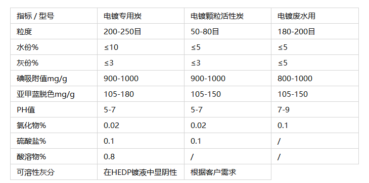 注:電鍍專用炭:可溶性灰分在HEDP鍍液中顯陰性,避免在處理電鍍溶液時產生雜質而影響電鍍效果